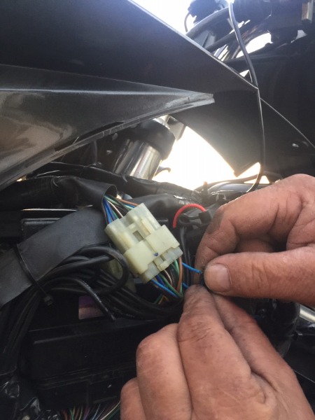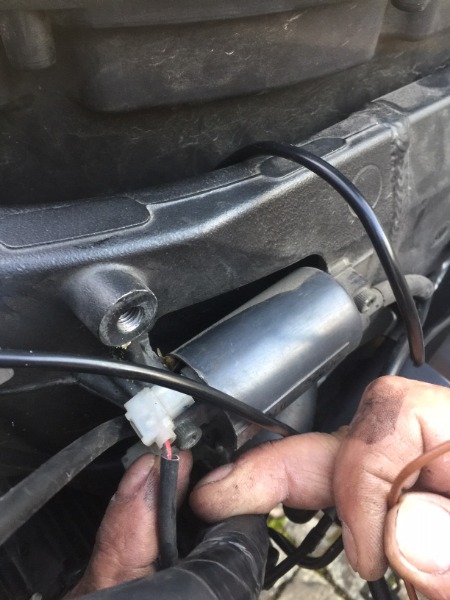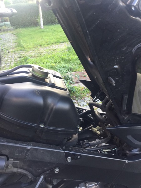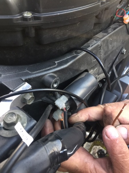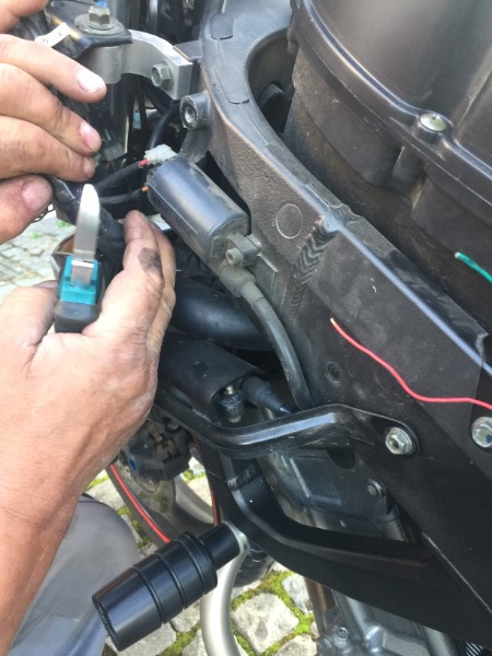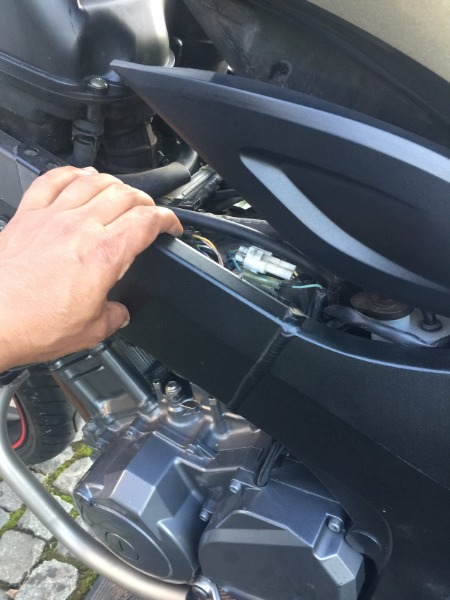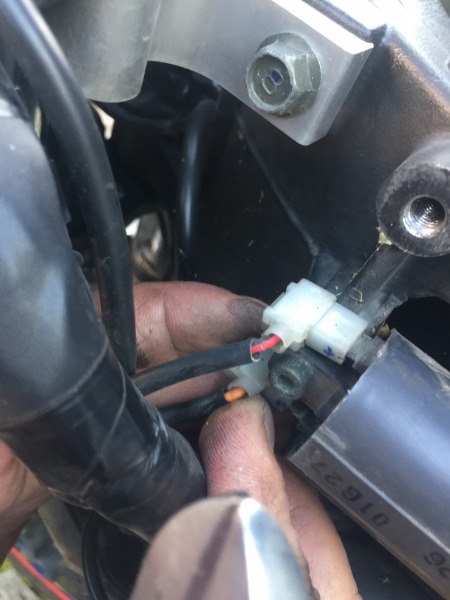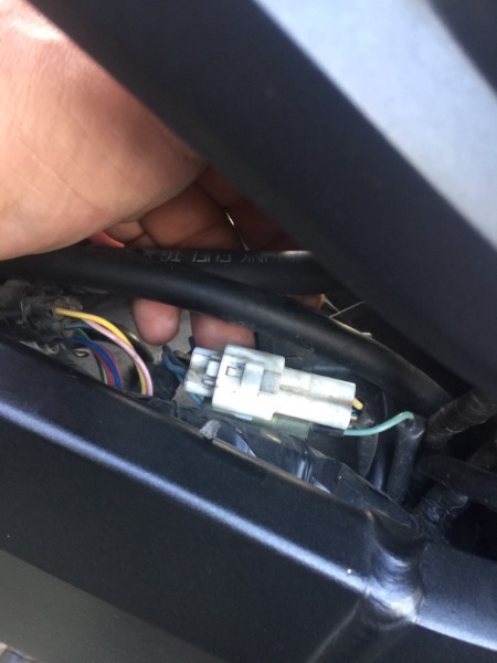 Pour le branchement, je ne vais pas m'attarder sur le fait qu'il faut enlever la selle, les caches latéraux et lever ou enlever le réservoir (moi, j'ai juste lever le réservoir en le tenant avec un élastique), et puis vous allez voir sur le côté gauche de la moto en dessous du réservoir, un connectique qui ressemble à la photo... , avec un petit tournevis, vous poussez sur le petit bouton pour débloquer la connection (voir photos), puis vous branchez les connections de l'indicateur de vitesse sur mâle/femelle, femelle/mâle ( plug and play)... jusque là, tout est facile.