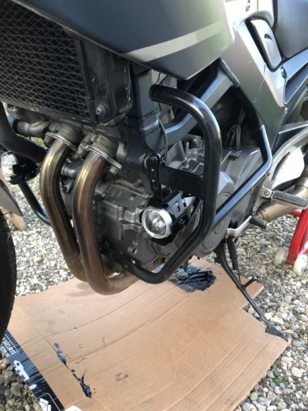 En effet, je les avait précédemment monté néanmoins cela ne me convenait pas (pas possible de régler le faisceau lumineux, mâchoire qui attaquait le crashbar, etc...). Du coup j'ai réfléchi au sujet et j'ai d'abord pensé à souder ou percer des équerres sur la partie plate entre le crashbar et le moteur. voir photos ci-jointes.