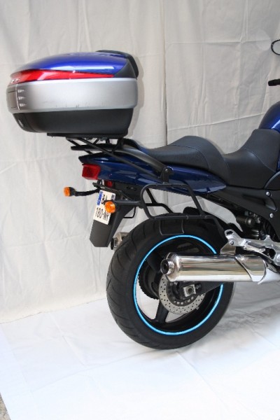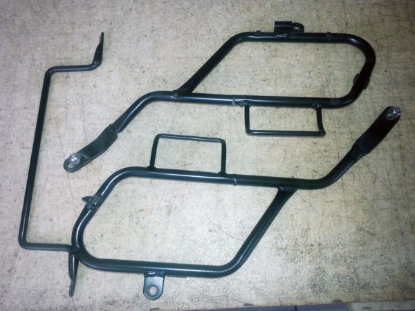 Il a été repeint en epoxy et modifié pour se fixer sur le haut de la platine repose-pieds passager afin de pouvoir utiliser les clignotants d'origine. Cela fait une pose plus discrète et ça évite de démonter les clignos d'origine.