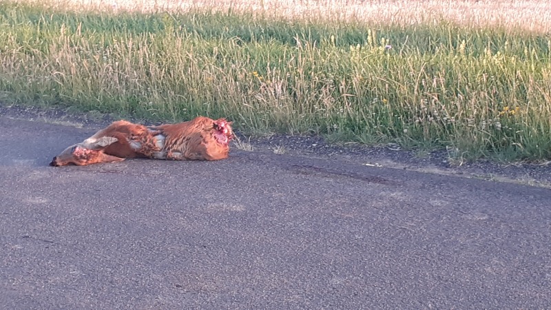 Donc, de bon matin, je m'en vais faire un petit tour, et paf, un (petit) chevreuil sort inopinément d'un bas côté non tondu (pour cause de protection de la planète) alors que la route passait entre des cultures pas très hautes.