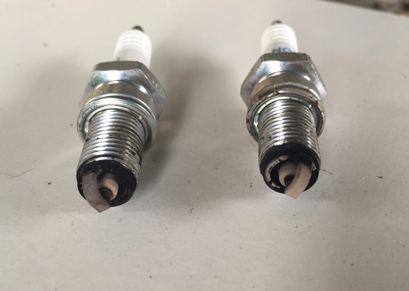 - En démontant les bougies toutes chaudes (le moteur ayant était coupé pile quand ça ratatouillait), on s'aperçoit que cette fois les 2 sont noires, pleines de suie.