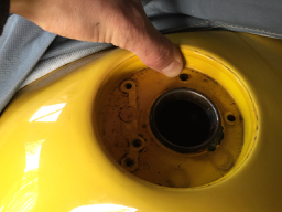 J'ai vérifié en mettant un coup de soufflette : le tuyau rigide communique bien l'air de la durite du dessous jusqu'à la cuvette du bouchon (là où je mets mon doigt sur la photo). Donc l'évacuation du trop-plein d'essence est assurée (si je sais pas viser à la pompe ! ) Mais par contre je ne vois pas comment l'air communique jusqu'à intérieur du réservoir.