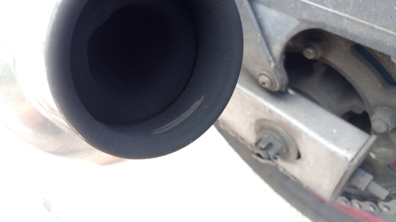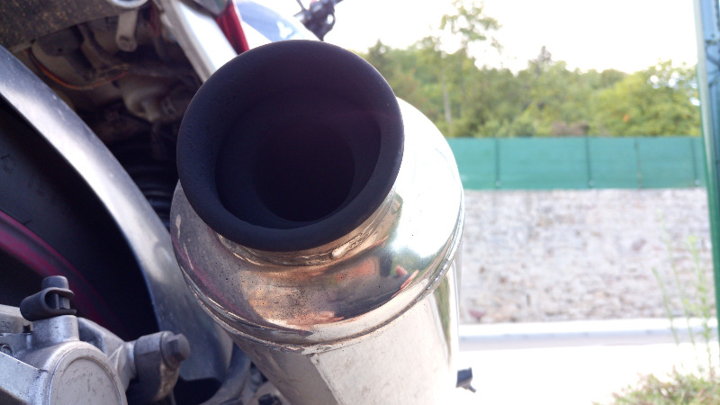 Sortie pots d'echappements: comme sur la bougie. Sur le pot gauche, j'ai frotté un peu pour voir l'épaisseur du carbone.