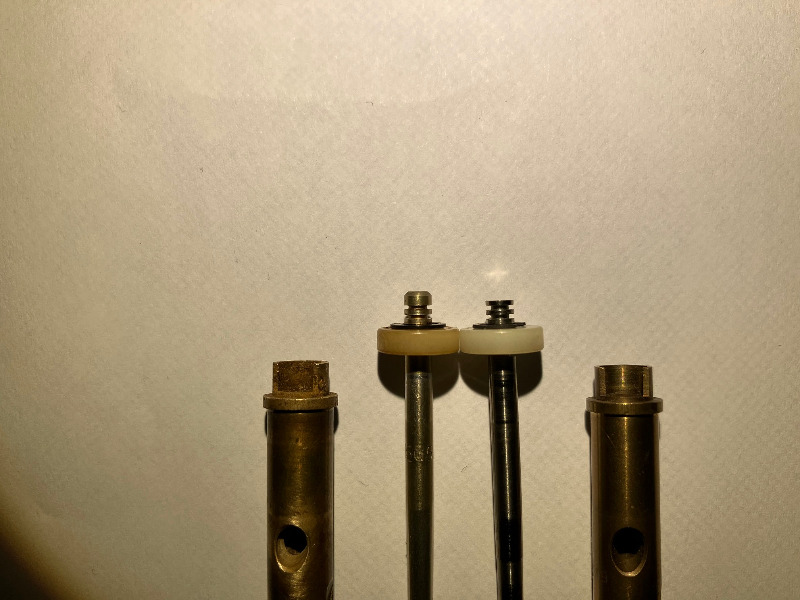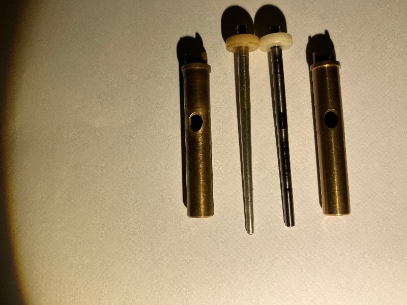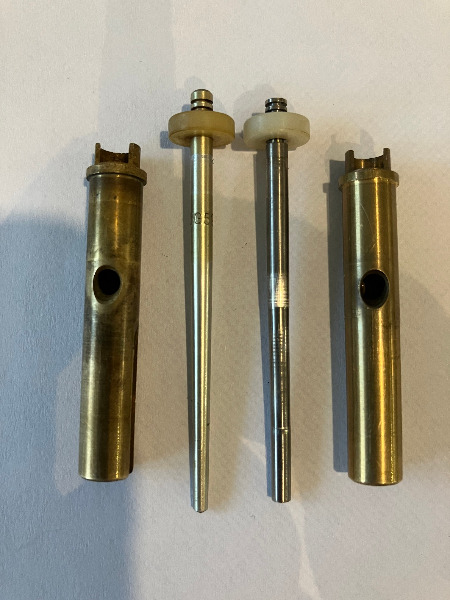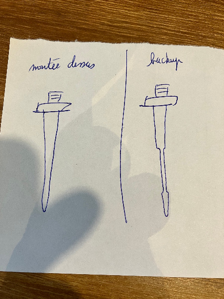 Sur l'aguille de "backup" de la vieille rampe, déja ce n'est pas la même forme aux extremités (pourtant les ref sont les memes) et ont sent en tatonnant l'aiguille qu'elle possede plusieurs diametres différents et que le "cone" de l'aiguille n'est pas régulier comme l'autre. (j'ai fait un dessin un peu maladroit mais compréhensible je pense).