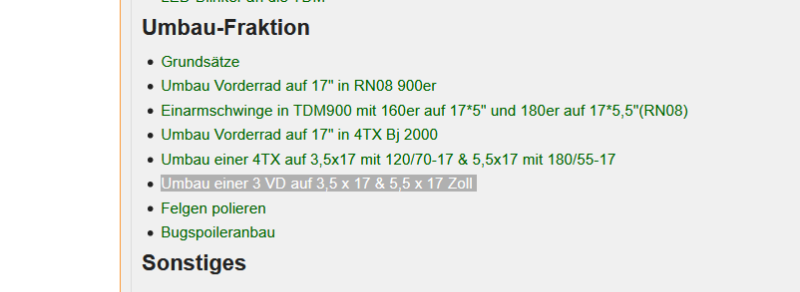 Sinon sur le site du fofo allemand tu vas dans le wiki rubrique "Schraubereien" (bricolages) puis "Umbau-Fraktion" (section modifications) puis "Umbau einer 3 VD auf 3,5 x 17 & 5,5 x 17 Zoll "