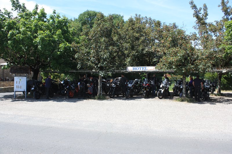 On prend d'assaut le parking du restau, les bécanes à l'ombre, il restera des places au soleil pour les touristes en bus !