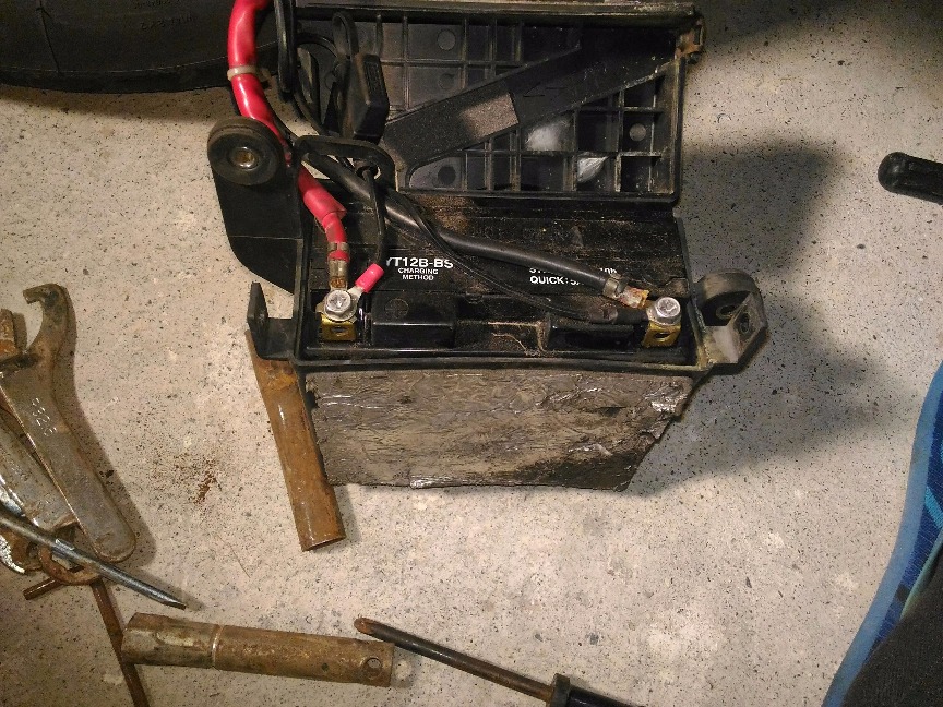 J'ai pour ma part enlevé les deux vis de la durite de frein arrière, ça laisse du jeu, enlevé la vis qui qui tient le lèche roue (juste une çà laisse le jeu nécessaire, celle de devant) et le guide de la durite de frein prends lui aussi assez de jeu, je dévisse le bocal de liquide de frein et je le sors du cadre et la batterie sors en 2 mn.