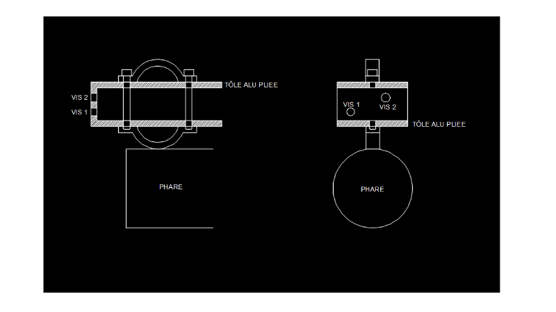 J'ai essayé de faire un petit schéma. Le feu 40W sera placé à coté du klaxon, que je décalerais surement un peu. Ma patte de fixation sera tenue sur deux vis :