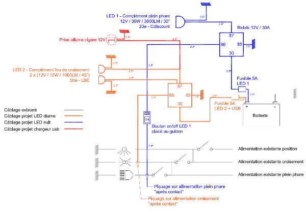 ridley écrit: en bleu jusqu'au 86 mets du 1.5, par contre ta masse led1 led2 et usb doit être du 2.5. perso je préfère une prise allume cigare à laquelle j'adapte un usb si besoin. Il faut savoir que l'usb c'est du 5.5v et que cette diminution consomme du courant. Pour led2 fait partir direct 2 fils + du 87 c'est + facile à installer
