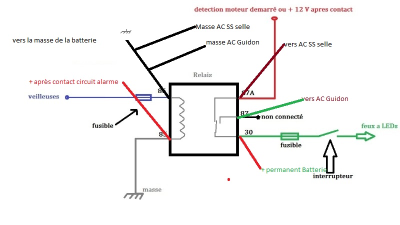 J'ai laissé le + après contact branché sur le relais pour alimenter celui sous la selle lorsque je coupe le contact.