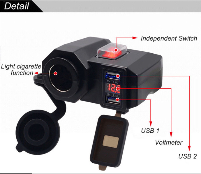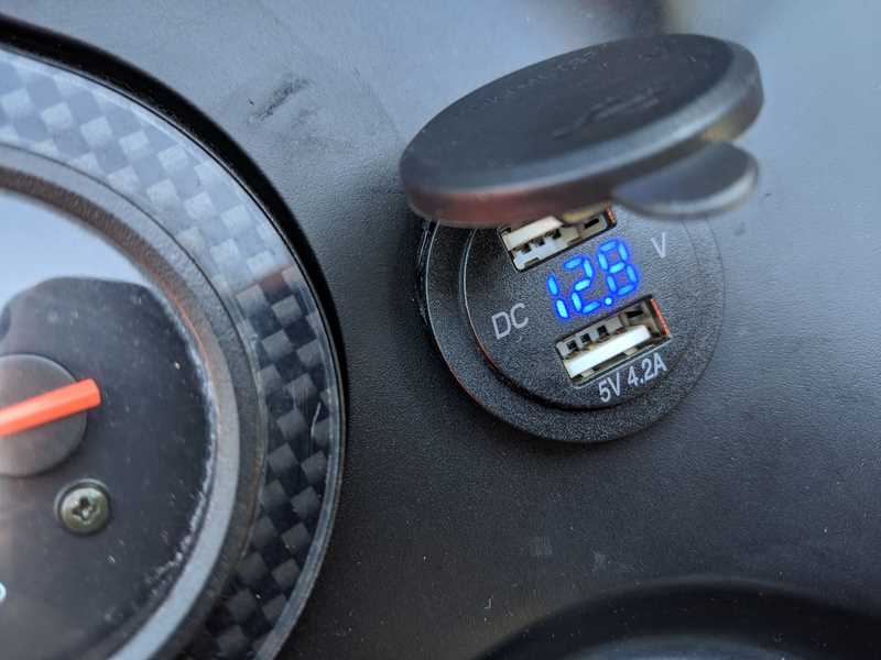 J'ai trouvé sur Aliexpress un "Voltmètre/thermomètre/2 prises USB" qui s'enfiche normalement dans une prise allume-cigare. Ça vaut 2 ou 3 euros et c'est IP-walou.