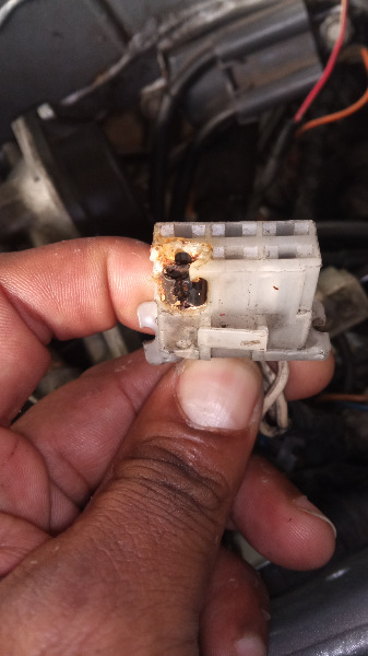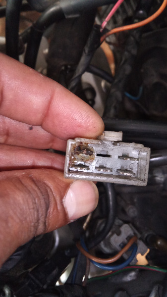 En demontant le connecteur du stator ( celui a 3 fils blancs en forme de T), je decouvre que le plastique autours d une des fiches a fondu.