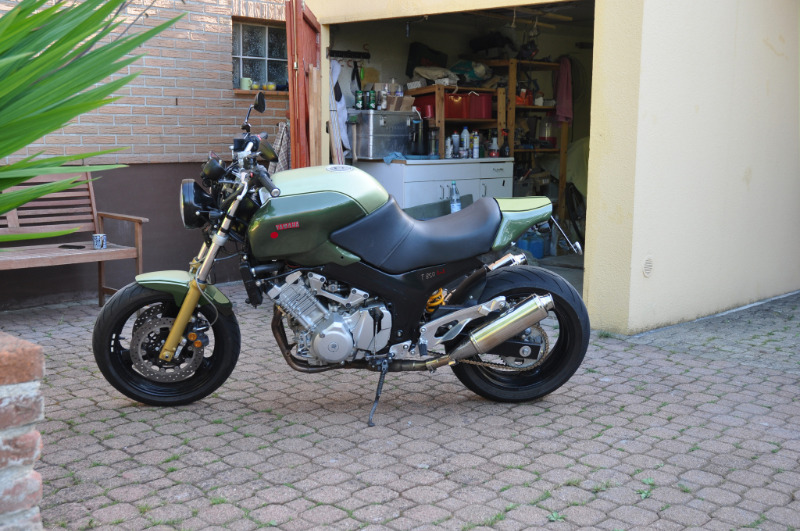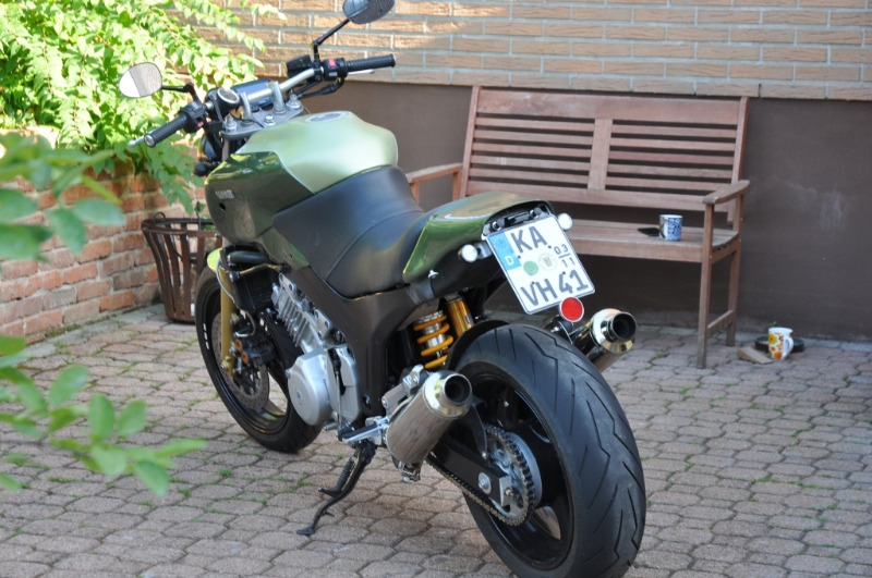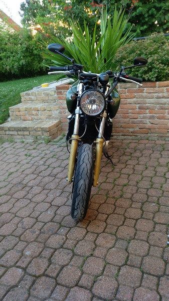 Ben oui ;-) Des Jantes de Suz Bandit 1200 et quelques modifs (fourche, commandes reculées etc....) Le réservoir ce ne sont que des caches faits sur mesure et de la peinture. Bon il y a eu du boulot pour l'échappement et la fourche a été adaptée au poil près par des copains qui font de la mécanique pour circuit (des pros qui ont des bancs test et autres fantaisies) Paraît que la machine est un vrai scalpel qui trace en Forêt Noire.... :cool: