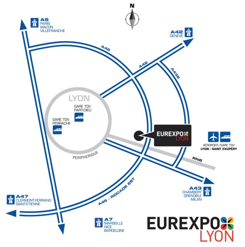 De la Gare TGV et de l’Aéroport Lyon-Saint Exupery : 35 minutes Rhônexpress jusqu’à Vaulx-enVelin La Soie puis Navettes Direct Eurexpo (Ligne 100).