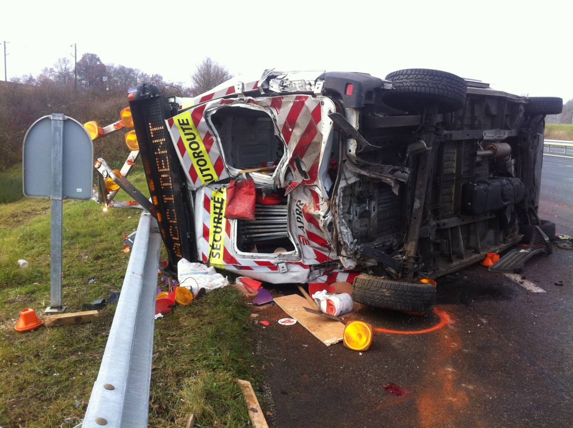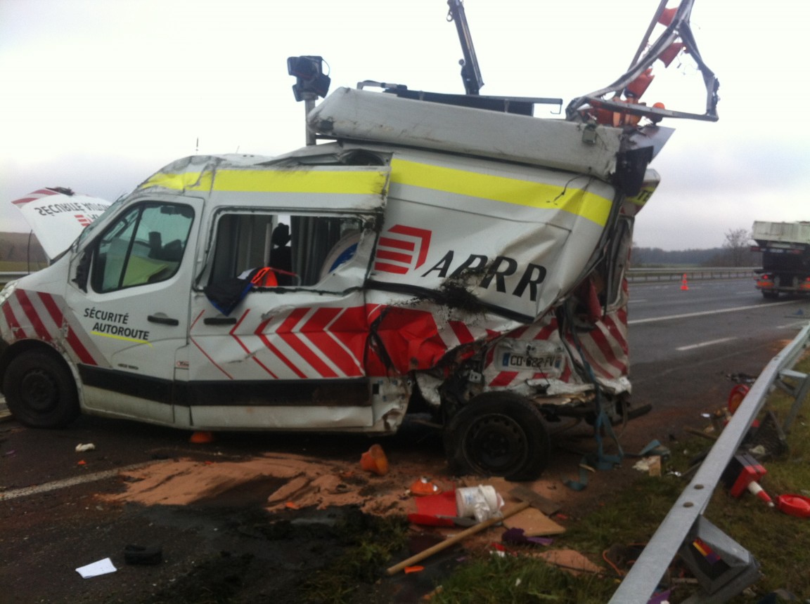 Ces fourgons font 2.5 m de large, 3 m de haut, bardés de bandes rouges et blanches, de gyrophares, de panneaux lumineux et même commeça, certains n'arrivent pas à les éviter :( En espérant pour le personnel que ce ne soit que du matériel !!!
