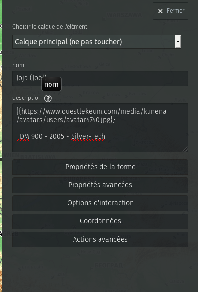 Et à moi tu as changé mon pseudo :vv: Trop fort Jean-Marc !axilum écrit: Franck, c'est à toi de créer ta position sur la carte. On l'a laissé à la main des utilisateurs.