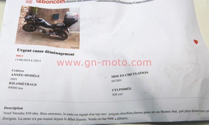 la moto n'était pas du tout dans l'état des photos , 1 an dans une grange, pleine de poussières, plus de batterie, alarme, bref, je fais confiance à tout le monde, quoi, surtout a un gars dans le besoin qui roulait en TDM !