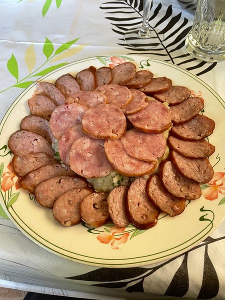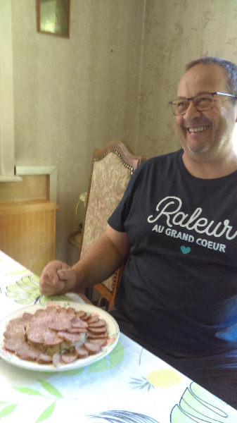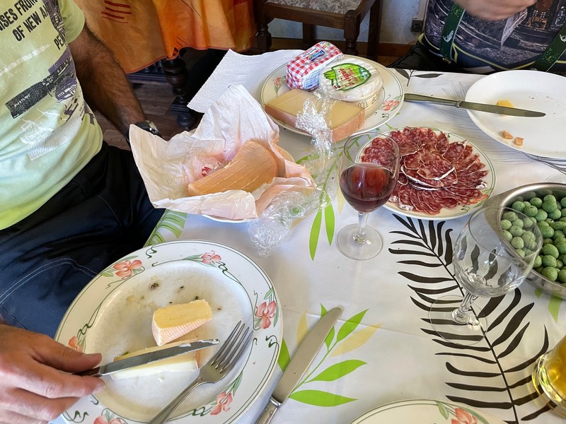 saucisson, assiette Bourguignonne (ex franc comtoise ) , patates, saucisse de Morteau, Montbéliard (1 assiette par personne, pas de demi portion avec Manu) , fromages, moelleux au chocolat, accompagné d'un rouge, bière, café et pousse café !