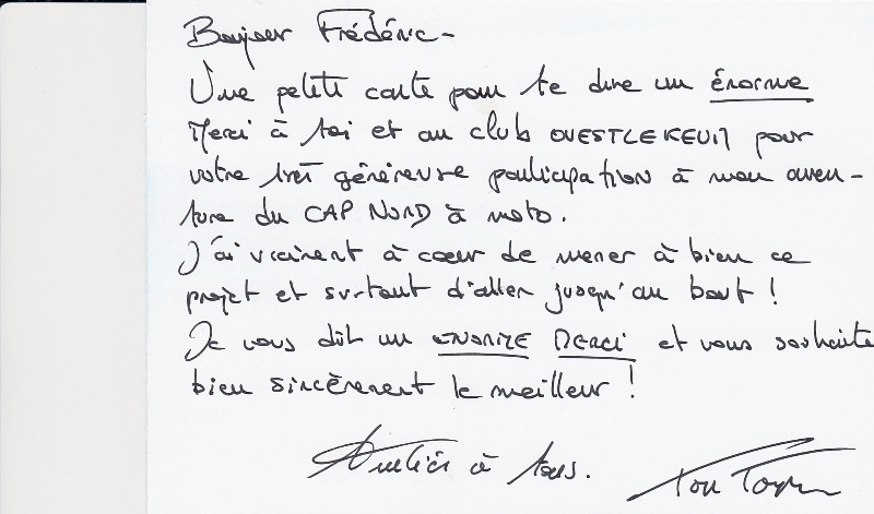 Comme Michel, garde l’argent pour ton voyage mais merci pour la carte et les autocollants déjà posés sur la KTMUn petit mot à Thomas.....