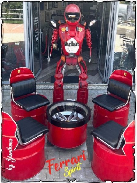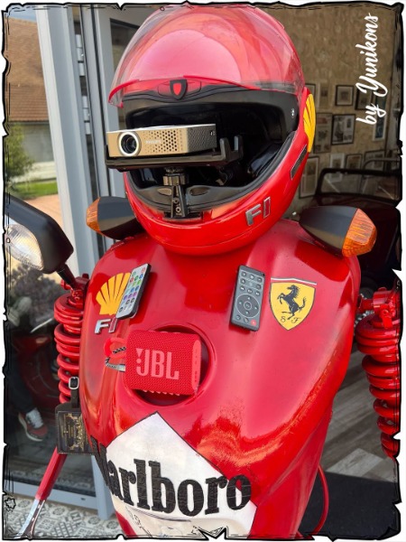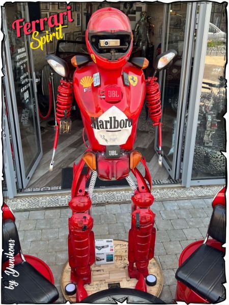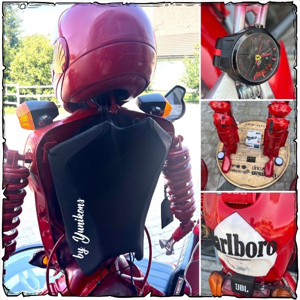 ==> premier poste: vente de pièces occasions et ensuite tri acier, alu, batteries, huile, et plastiques, pneus en déchetteries, et quelques pièces non vendables (ici un échappement, un réservoir et des amortisseurs de Yamaha 850 TDM, un phare arriere de 1300 FJR), et la créativité d' Abed (on bossait ensemble dans nos vies d'avant