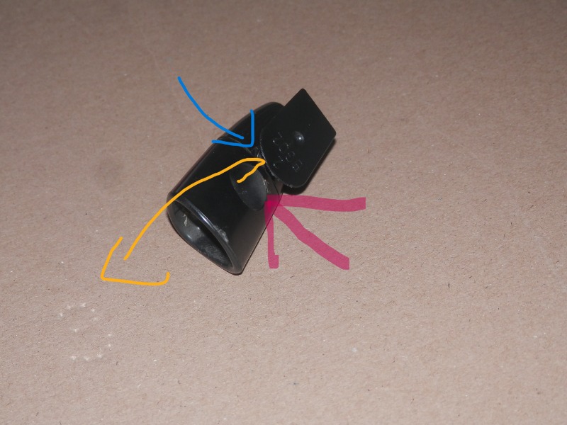 et c'est là qu'entre en jeu l'efficacité du Chinois, parce que la sortie il ne l'a pas fait derrière bêtement mais en dessous et si tu regardes l'explication ci-dessous tu verras que la sortie est désignée par la fleche rouge les ultrasons jaunes ( je te rappelle qu'ils sont chinois ) tapent dans le pied de l'appareil ( fleche bleue ) et repartent ( bien énervés ) vers l'avant......