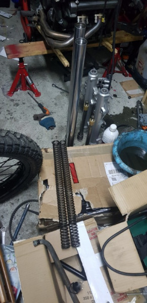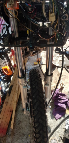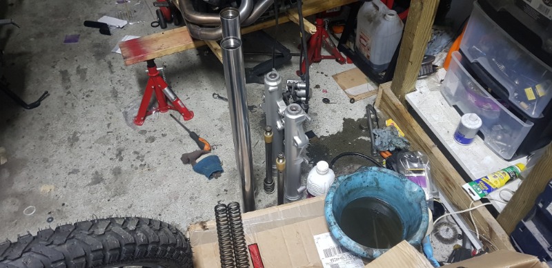 Donc la moto est tombée , bas faut tout re régler la fourche a l'avant ... donc bas je démonte , roue frein , et cette fameuse fourche ...