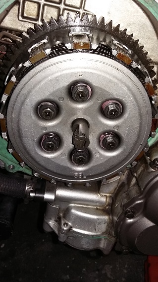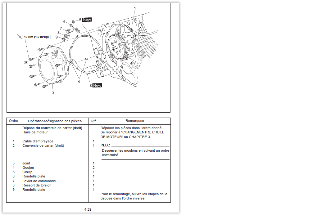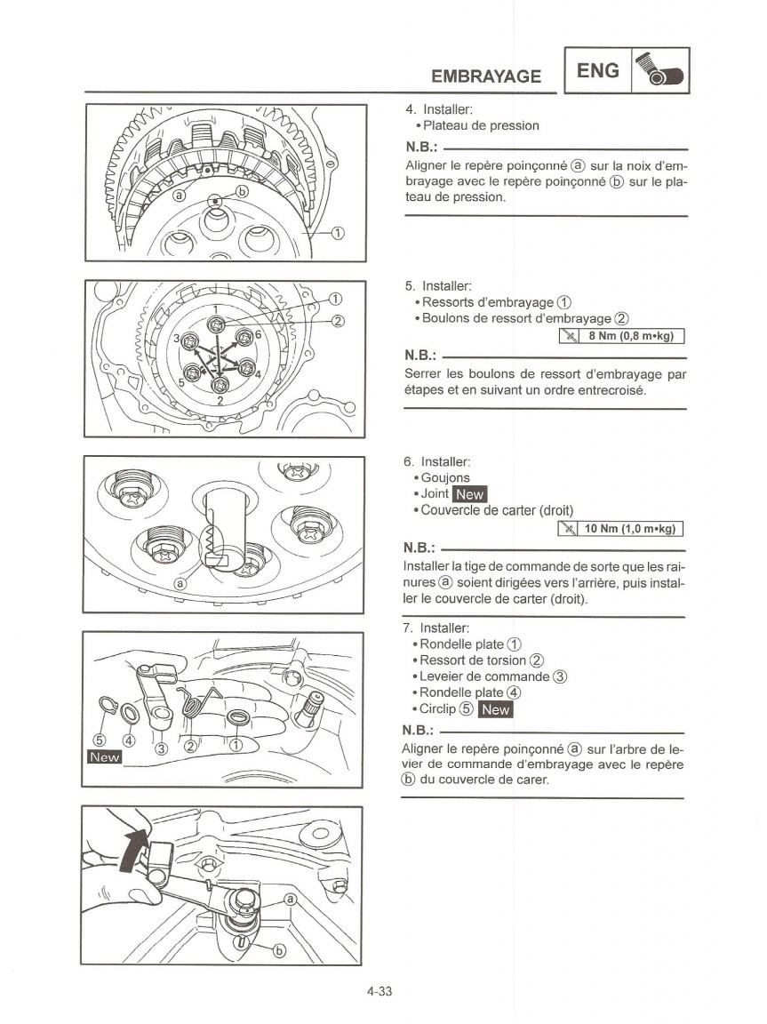 Je précise y a pas d'huile dans le moteur pour le moment, et je trouve qu'il y a beaucoup de jeu dans la tige de débrayage(repere 2), pourtant le roulement et la rondelle sont bien présente(repere 3 et 4), j'ai contrôlé le montage du dernier disque et la position du disque de pression, mais que nenni c'est pareil, alors ma question les ressorts de pression doivent être serrer avec ou sans jeu ? Le jeu de la tige de débrayage est il normal ? Et pour la repose du carter avec l'axe du levier(repere 18 a 27), on doit faire coïncider les repères avant ou après la pose ?