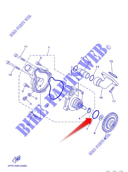 le joint rep 7 fait le lien entre carter huile et pompe a eau (donc, c'est de l'huile) , si il a fuite de liquide refroidissement, c'est en général le joint "mécanique" qui n'est pas détaillé chez Yam et qui se situe entre la turbine et le roulement, c'est lui: