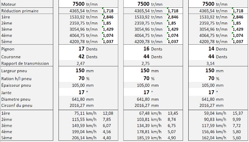 Bien sûr, j'calcule tout ça de tête à la 12ème décimale comme tout le monde, mais juste pour vérifier, j'ai fait un petit fichier excel qui fait ça aussi, à partir du rapport de transmission primaire, des rapport de boites, de la transmission finale, et de la taille des pneus. Je le mets en pièce jointe si ça peut servir...