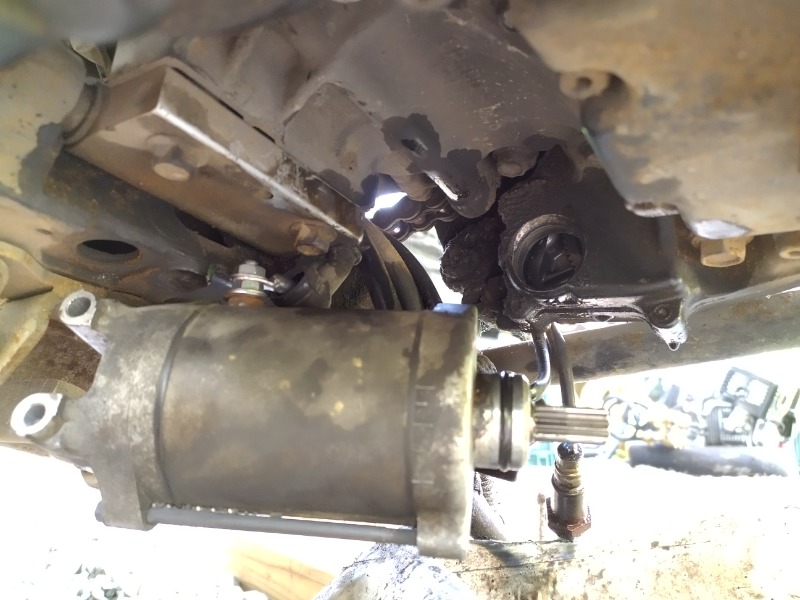 J'ai réussi à déloger le démarreur mais pour le moment il est encore maintenu, je suppose par le câble d'alimentation. Mais impossible de sentir (et encore moins de voir) où se fixe ce câble sur le démarreur.