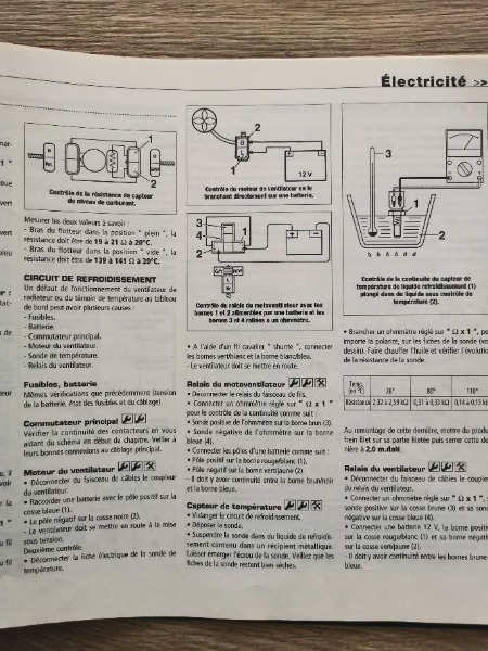 Bonjour, j'attends toujours la livraison des durits pour remonter. J'ai essayé de déchiffrer les schémas électriques mais c'est un poil compliqué. Est-ce que quelqu'un peut m'éclairer sur la référence du relais de contacteur du ventilateur, et le schéma simplifié de branchement entre les éléments suivants : Relais du radiateur, sonde de température du liquide, alimentation du radiateur. L'installation ayant été modifiée je veux remettre à l'origine (thermostat, ventilo et sonde testés OK).
