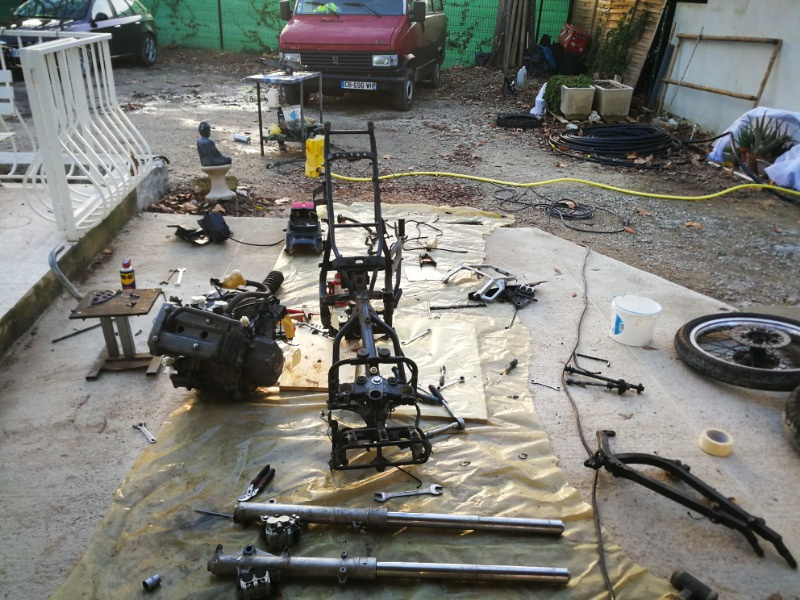 Puis enfin le demontage, la moto ayant eu sa 1ère vie en Normandie puis a antibes elle est bien bien rouillé, je rappelle que ma restauration et casiment seulement esthétique donc c'est surtout du sablage peinture qui m'attend..