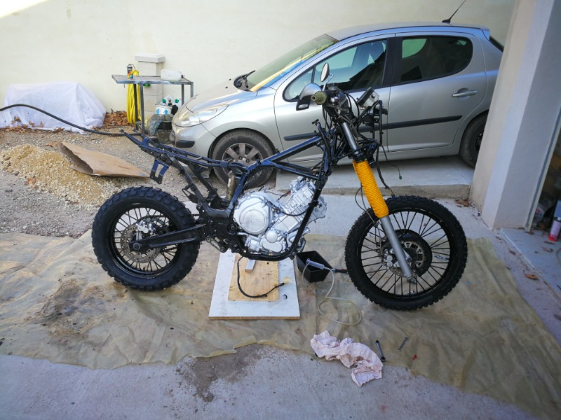 A ce niveau je pense amélioration donc je me fais des cale dans la fourche pour la durcir un peu, de la 20w et 5mm de serrage du ressirt d'amortisseur car le châssis laisse vraiment a désiré. En plus ca a marché, la moto est méconnaissable.
