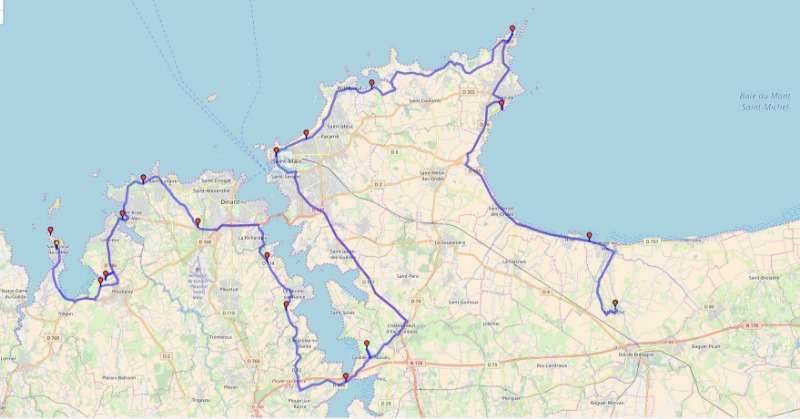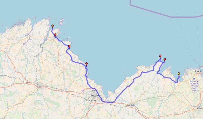 On est descendu à Saint-Brieuc par des petites routes puis après par la voie rapide sans virolos, puis à nouveau les virolos le long de la côte : Pordic, Binic, Saint-Quay-Portrieux, Plouha, Paimpol et Ploubazlanec où on a déjeuné au restaurant.
