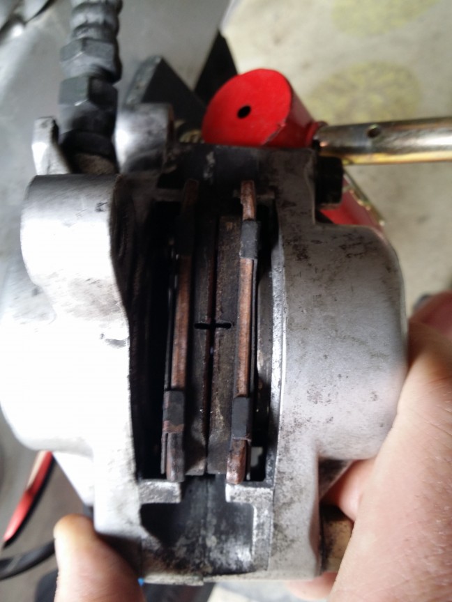 Donc en voulant aussi mettre des plaquettes neuves, je m’aperçois que le piston gauche, ( a droite sur la photo est bloqué)