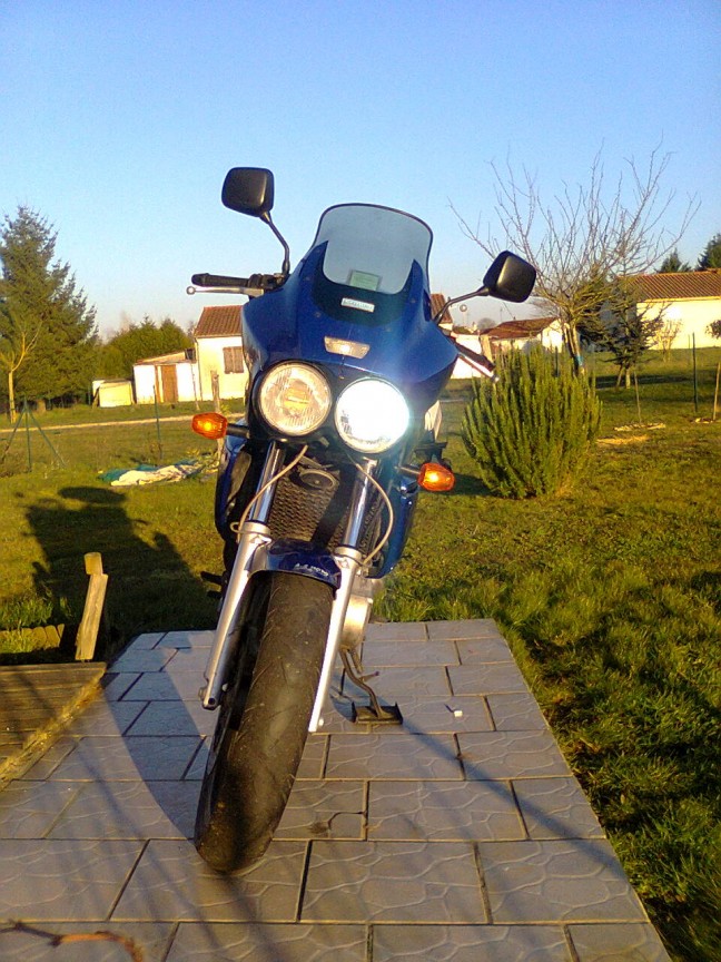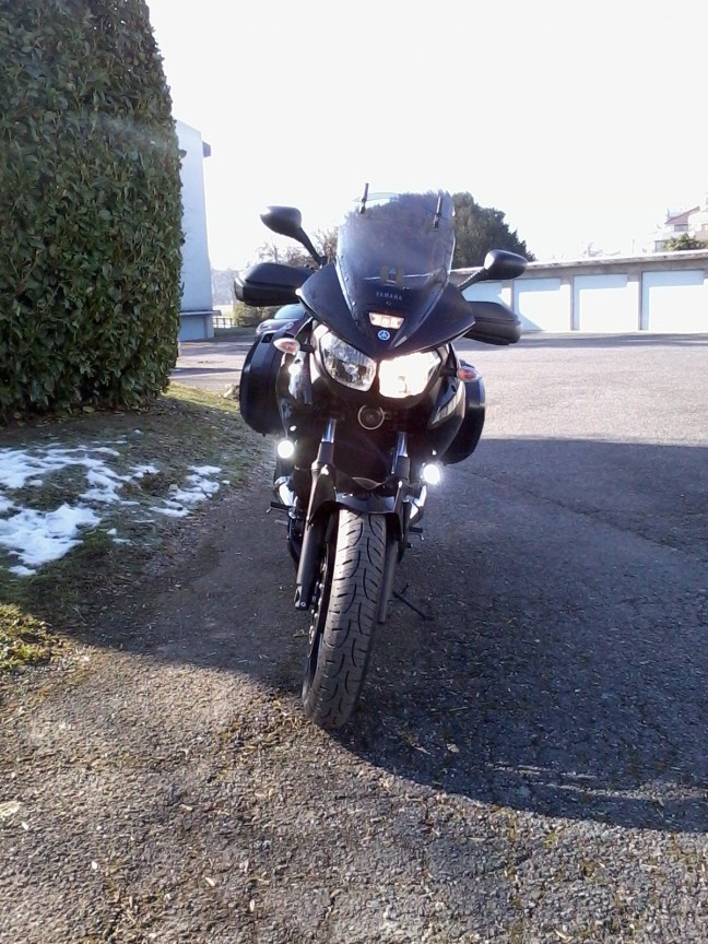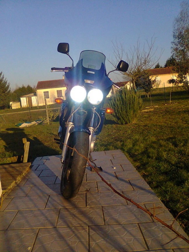 vinc01 écrit: Voici une photo avec les feux allumés, pas encore eu le temps de faire un tour la nuit (vu la température) j'ai fais une balade de 50km ce matin avec soleil et 3°, j'ai rencontré un ami en voiture, il c'est mis devant moi et n'a pas vu de vibration sur le montage