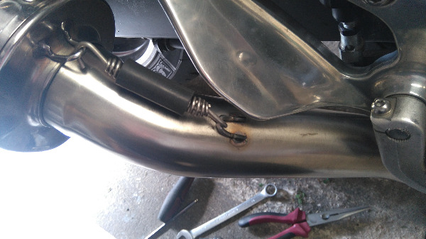 Je roule en duo et de plus avec valises, et ça m'a tout de même inquiété est ce qu' à charge et sur une chaussée irrégulière le bras oscillant ne va pas toucher les pots ? Je me suis rendu vite fait chez mon concess qui m'a confirmé que le bras risqué de toucher les silencieux à charge. :tole: Il m'a conseillé de monté le collier complètement à l'extérieur de la platine et non comme sur la photo ci-dessus. Démontage à nouveau des silencieux, un essai avec montage des colliers, mais trop juste pour être certain que le silencieux ne touchent pas le bras oscillant à charge.