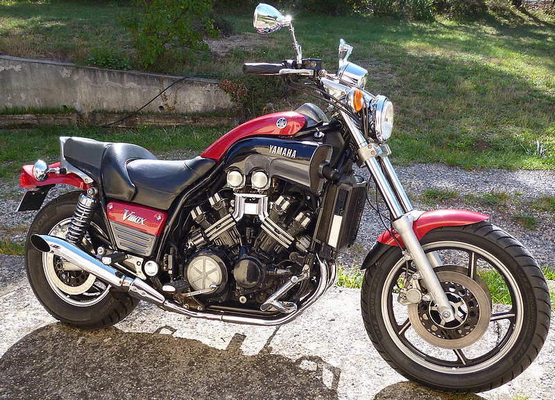 La fameuse Vmax, j'en ai eu deux, celle ci est une 88 partie l'année dernière, c'est toujours une exception inclassable dans le monde de la moto, j'aime bien mais je les garde pas, impossible de rester sage avec ce truc en version full, c'est d'une violence qui pousse au crime ...