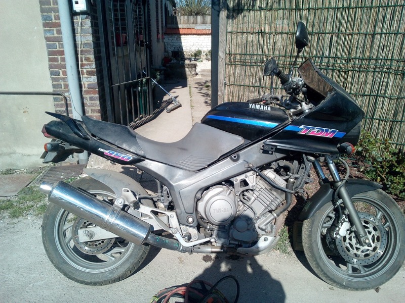 La voilà ! Bon il manque des carénages, rien n'est fixé etc.... Mais d'ici 3 ou 4 jours elle devrait être roulante. Le plus gros est fait déjà. J'avoue que j'avais beaucoup hésité à l'acheter et le prix très bas m'a fait craqué. Résultat : je pensais en avoir pour 300€ à la remettre en état et je m'en sors pour 60€ jusqu'à maintenant avec seulement une batterie neuve et un relais de démarreur. Reste à voir une fuite à l'échappement et peut être un amortisseur. Après ce sera vidange, purge des freins, etc et ça devrait être bon. Très contente de mon achat et hâte de l'essayer !!