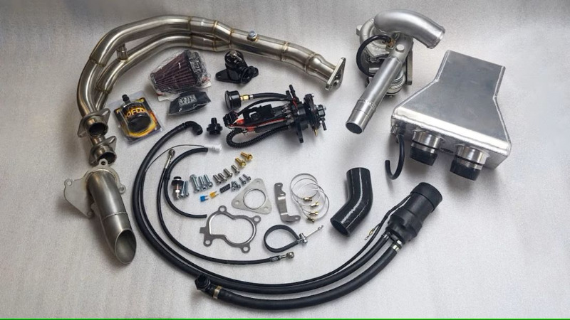Turbocompresseur d'échappement et accessoiresLa conversion concerne principalement le système d'échappement, dans lequel le turbo, un type GT15 modifié avec soupape de décharge Garret, est intégré. Vous pouvez choisir parmi différentes versions en acier inoxydable et en carbone avec plus ou moins de circonférence, d'insonorisation et de poids. Puisque les turbocompresseurs hachent les ondes sonores, le bruit n'est pas un problème ici. Sous certaines conditions et dans le respect des valeurs limites d'émission, la conversion serait même possible avec l'homologation routière. Cependant, Extreme Creations en Australie n'a pas de rapports pour le TÜV allemand.