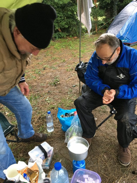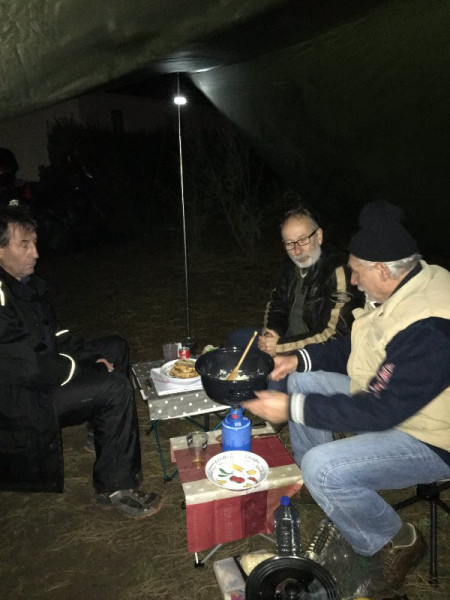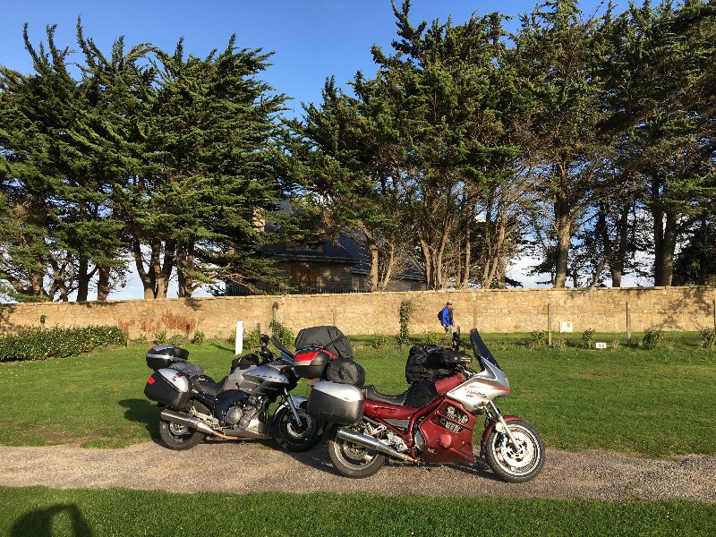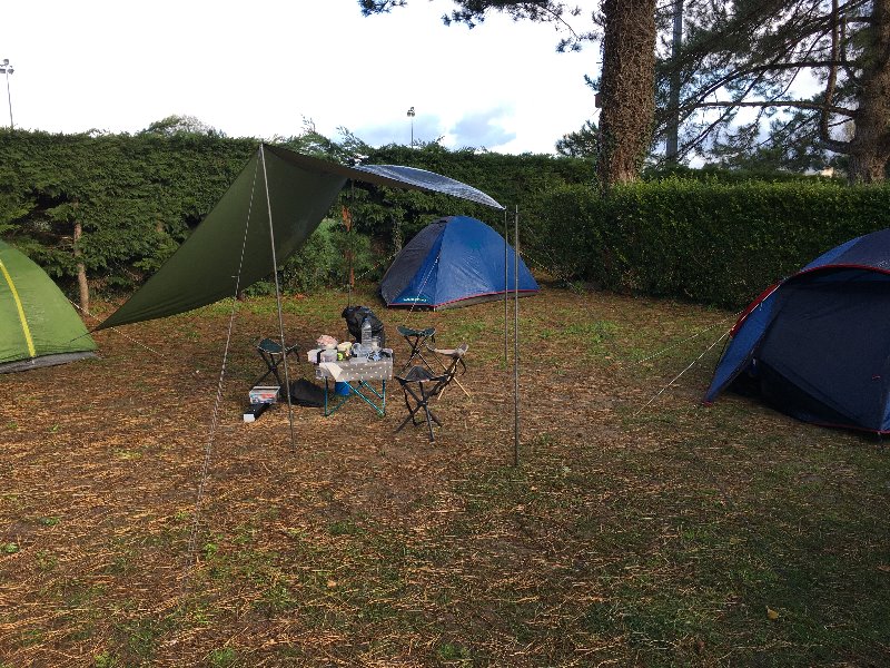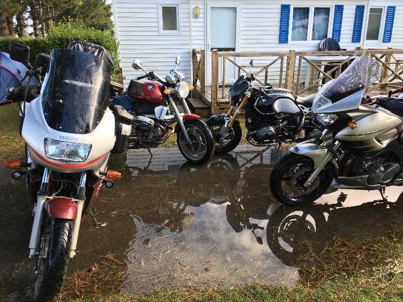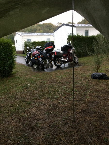 nous partîmes sous la pluie, roulâmes entre soleil, pluie grêle.. Arrivâmes sous le soleil mais en plein vent d'où changement de camping pour un plus abrité. mais pluie à nouveau pour monter les tentes