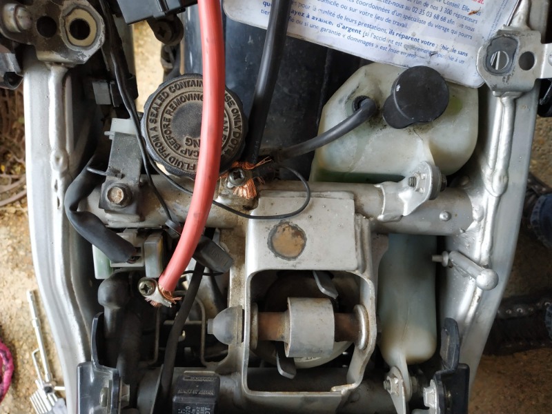 -enfin pour changer la batterie il faut juste bien isoler les 2 cables qui remontent jusqu'au relais pour éviter les touchettes et démonter le maitre cyl ar: ça sort en contournant l'amorto sans trop galérer. Mon conseil retiens bien la procédure pour recharger ta batterie chez toi de temps en temps, un optimate est vite rentabilisé et il fait aussi ta voiture (frank en vend aussi!)